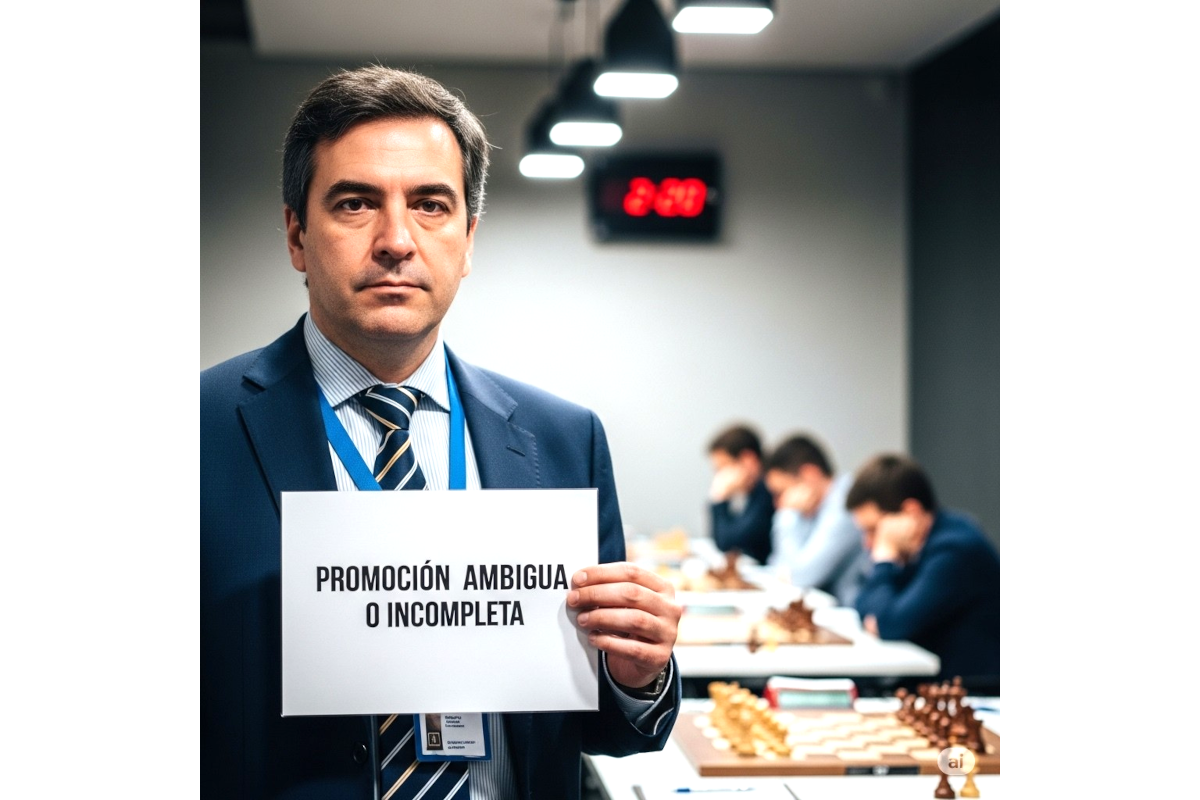 26/08/2025 – La promoción ambigua o incompleta es una de las irregularidades más delicadas en el arbitraje de ajedrez, especialmente cuando se juega a ritmo de rápidas o blitz bajo presión de tiempo. Según las Leyes de la FIDE, una promoción solo es válida si el peón se sustituye inequívocamente por una pieza reglamentaria antes de pulsar el reloj. Su correcta interpretación exige del árbitro precisión técnica, criterio objetivo y coherencia para salvaguardar la equidad. | Imagen: Uvencio Blanco Hernández