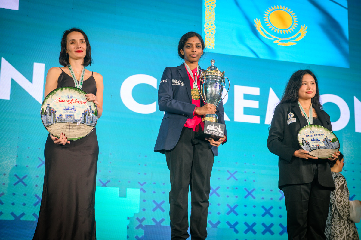 19/09/2025 – Vaishali Rameshbabu ganó su segundo Gran Suizo Femenino consecutivo, tras sumar 8/11 puntos y obtener una mejor valoración que Kateryna Lagno en los desempates. Ambas jugadoras se clasificaron al Torneo de Candidatas 2026. En la última ronda, Vaishali logró tablas con negras frente a Tan Zhongyi, mientras que Lagno empató sin problemas contra Ulviyya Fataliyeva. Bibisara Assaubayeva perdió una gran oportunidad de unirse a ellas en un triple empate por el primer puesto. | Foto: FIDE / Michal Walusza