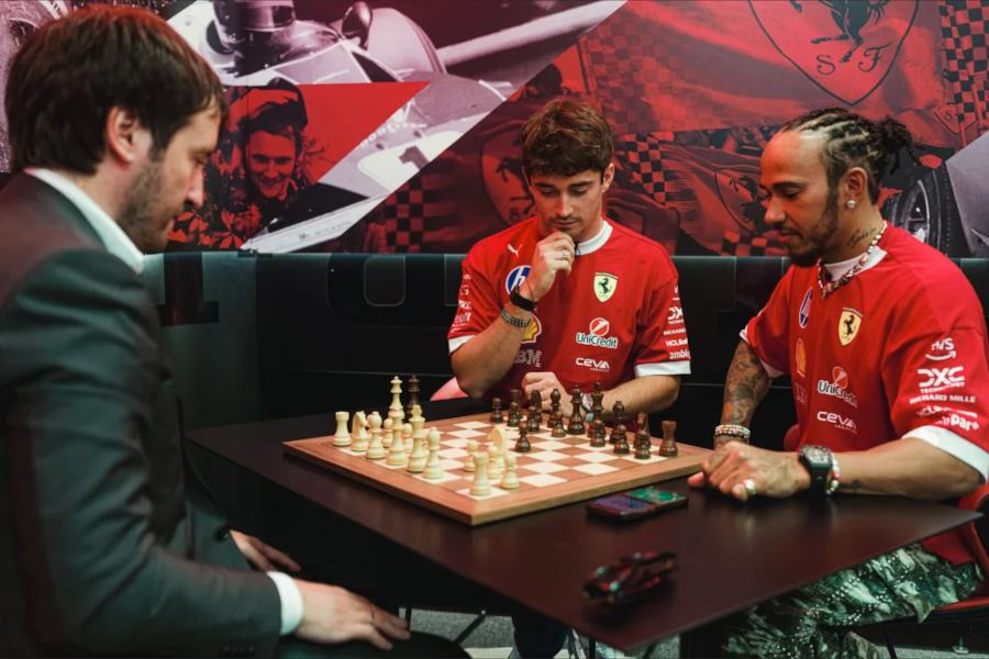 22/09/2025 – Los pilotos de Ferrari, Charles Leclerc y Lewis Hamilton, comparten un interés común por el ajedrez. Su rivalidad ha incluido anécdotas divertidas sobre partidas en línea y un engaño mutuo. Antes del reciente Gran Premio de Bakú, ambos se reunieron con el gran maestro azerbaiyano Teimour Radjabov, quien observó su partida y les obsequió un regalo de temática ajedrecística, resaltando los vínculos culturales y estratégicos entre el automovilismo y el ajedrez. | Foto: Racing News 365
