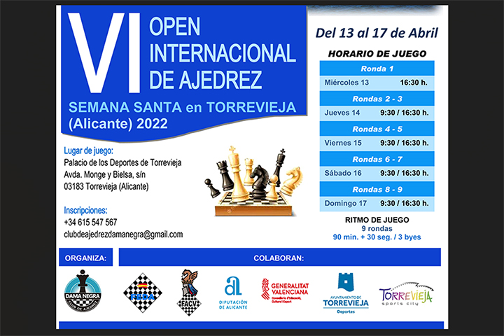 09/01/2024 – Entre el 27 de marzo y el primero de abril de 2024 se disputará la octava edición del Abierto Internacional "Semana Santa" en San Vicente de Raspeig, Alicante (España). El año pasado se alcanzó la cifra mágica de 500 participantes. Los organizadores ya están cerrando ofertas de alojamiento con entidades hosteleras. El torneo se desarrollará a lo largo de 6 jornadas de competición con un total de 9 rondas. El plazo de inscripciones terminará el 15 de marzo. Más detalles...