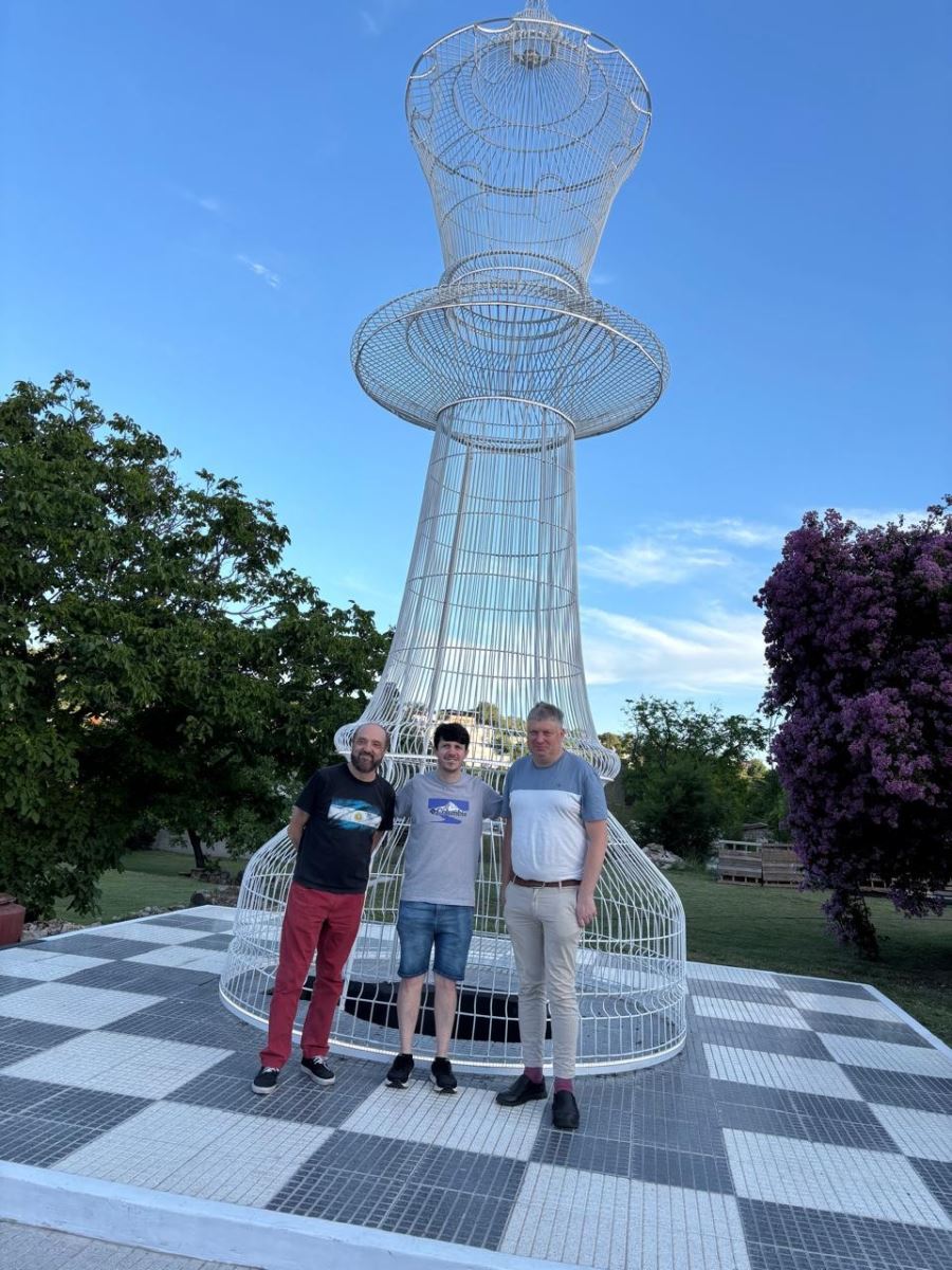 Antes de finalizar nuestro encuentro, le pregunto sobre la pieza de ajedrez más alta del mundo. Me dice que sí, efectivamente, se trata de una estructura metálica de 7.20 m de altura, ubicada en Río Ceballos y que, de noche, se cubre con un hermoso juego de luces. Me muestra una fotografía en la cual se encuentra acompañado por los grandes maestros Diego Flores y Alexey Shirov.