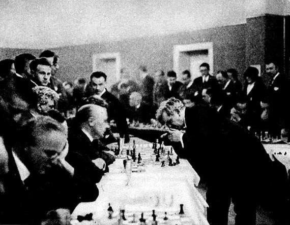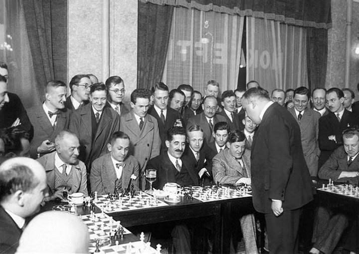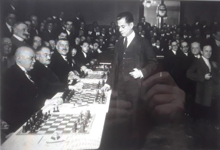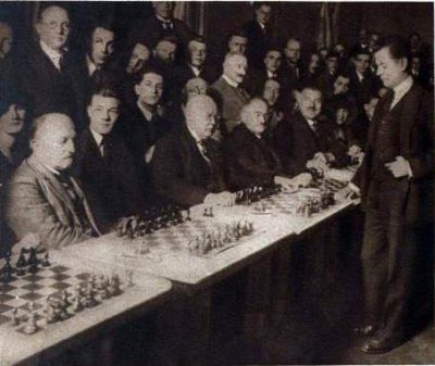 In October 1925 the members of the Schachheim welcomed the world champion, Capablanca, who gave two simultaneous exhibitions, each against 30 opponents. On October 27 Capablanca scored +19, =10, -1, and on October 28 the result was +22, =8.