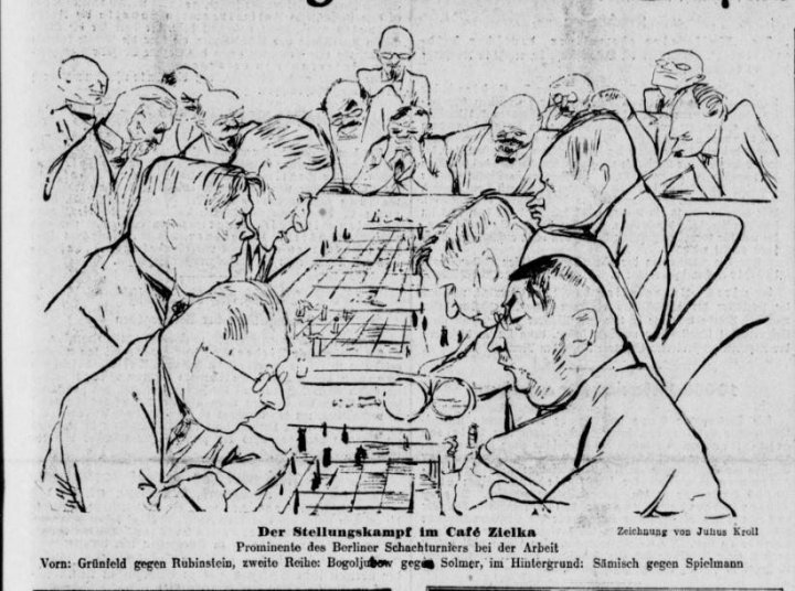 Berlin 1926 Left, front to back: Grünfeld, Bogoljubow, Sämisch. Right: Rubinstein, Johner, Spielmann, Volkszeitung, 25 November 1926, p1.