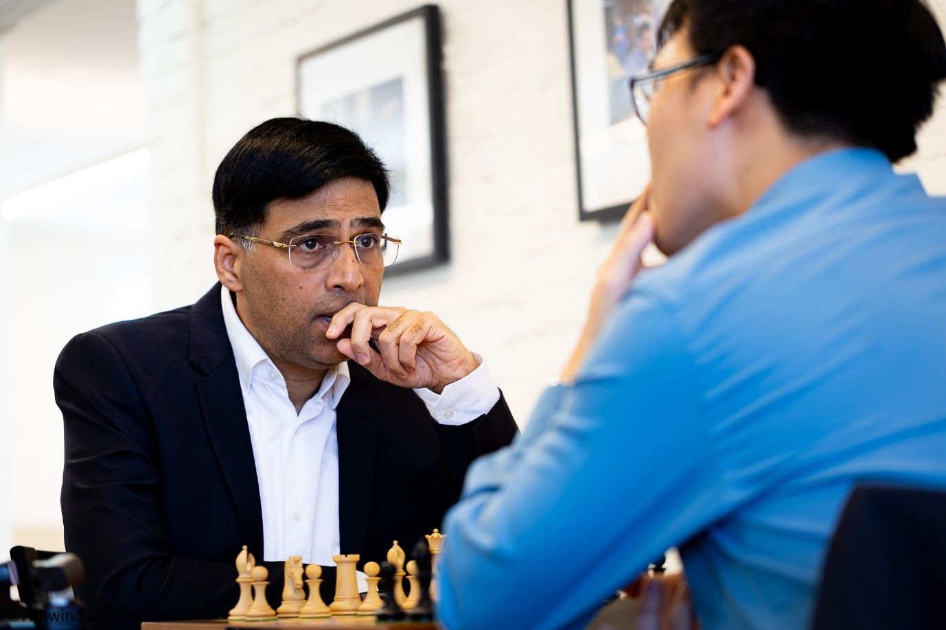 La concentración se siente casi a un nivel físico. Vishy Anand, en profunda contemplación, analiza la posición del día uno con Lê Quang Liêm.