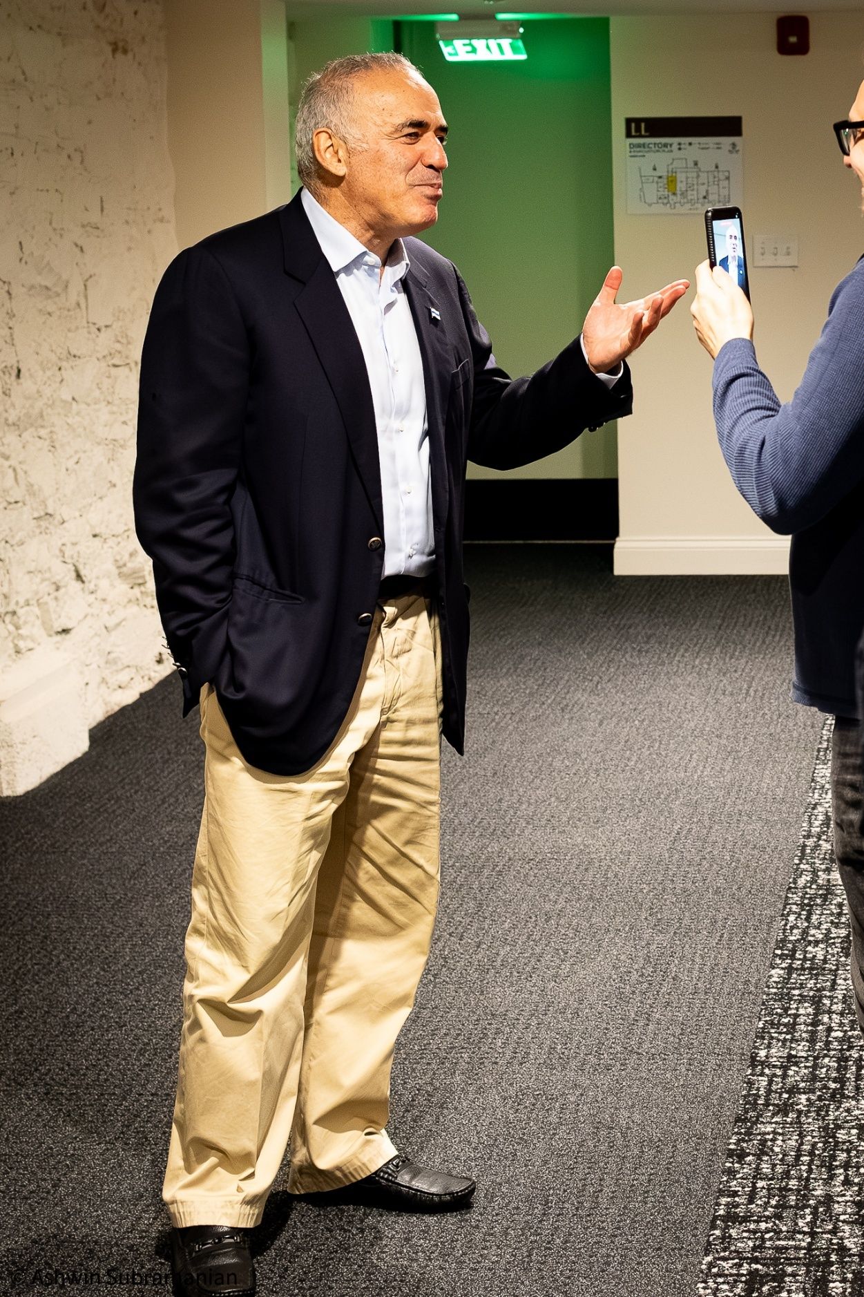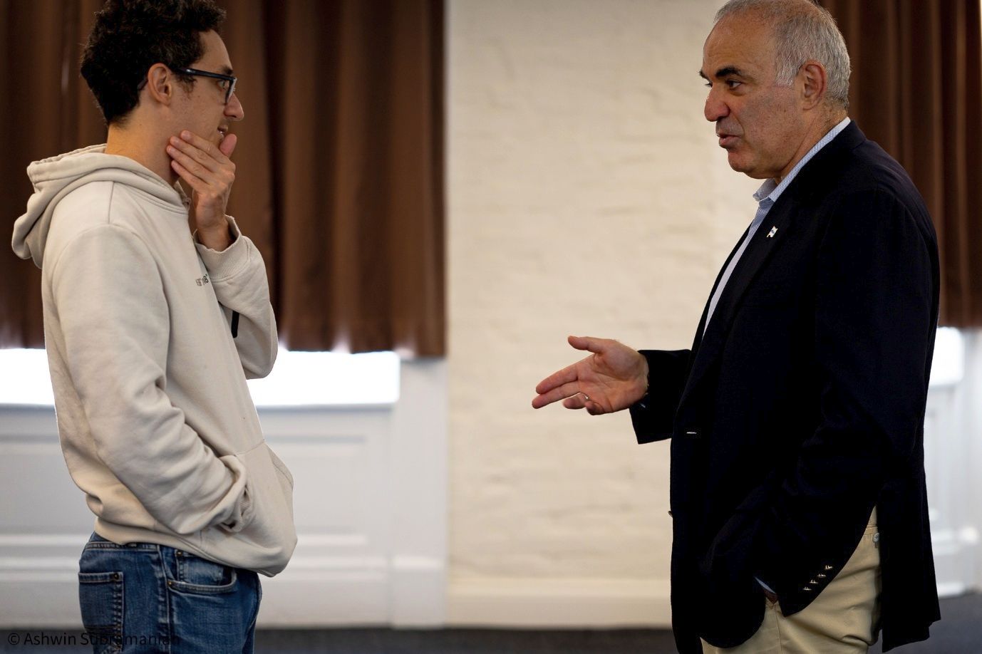 Garry Kasparov reflexiona con pasión sobre el día uno junto a Fabiano Caruana antes de que empiece el día dos de la competición.