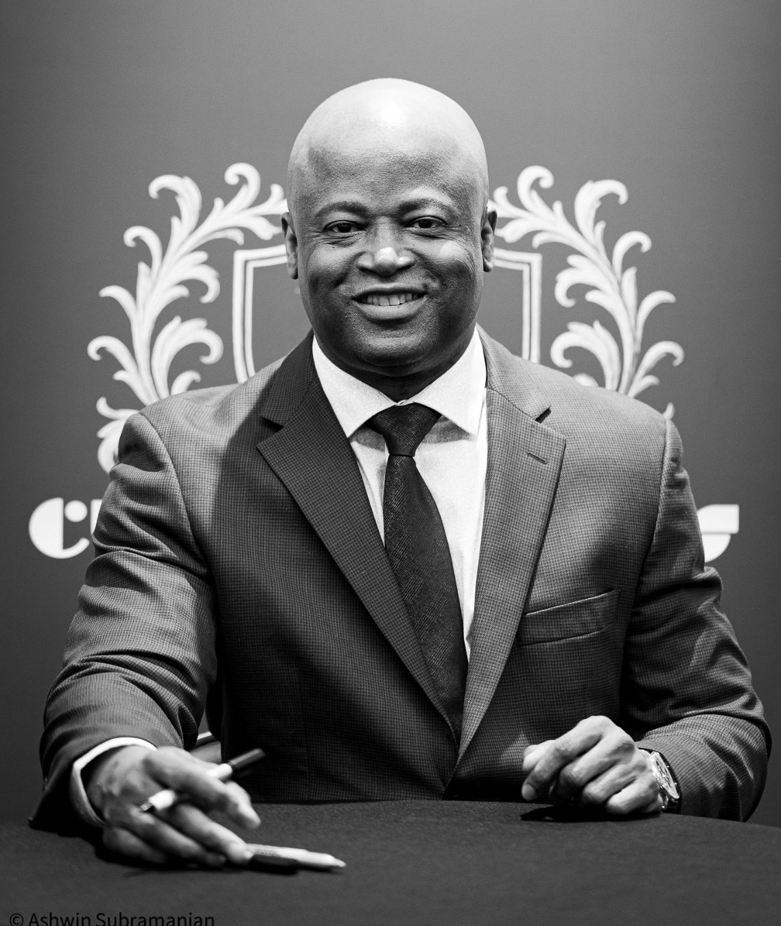 El GM Maurice Ashley, la voz icónica del ajedrez, captado en un retrato en blanco y negro. Se le veía impecable y listo para ofrecer comentarios de primera con su sello personal.