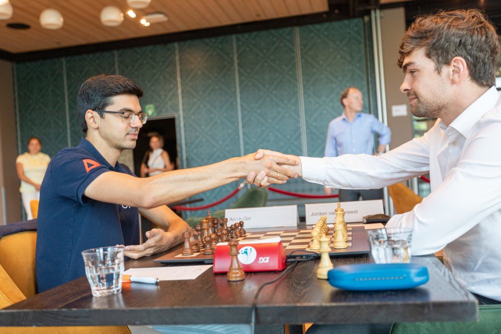 En la primera partida de desempate, en la que Giri jugaba con blancas, hubo otra italiana y otras tablas, pero duró mucho más que las dos partidas clásicas. Después de 77 movimientos, los jugadores firmaron tablas. En un final de torres, Jorden van Foreest tenía un peón de ventaja, pero eso no fue suficiente para ganar.