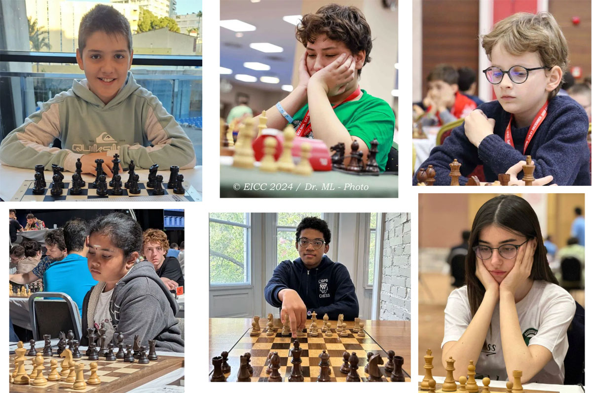 En el sentido de las agujas del reloj desde la esquina superior izquierda: Marc Llari (12 años), prodigio francés que ganó el Campeonato Mundial Sub-8 en 2022 y el Campeonato de Francia Sub-12 en 2025 [foto: Marseillechecs]; Atilla Kuru, un muy talentoso jugador turco de 14 años que tuvo una performance de 2750 en el Campeonato Europeo de 2024; Luca Protopopescu, prodigio francés que fue número uno del mundo en las categorías Sub-8 y Sub-9 [foto: FIDE]; Gulenay Aydın, una de las prometedoras maestras internacionales femeninas (WIM) de Turquía [foto: FIDE]; Brewington Hardaway, el primer jugador afroamericano oriundo de Estados Unidos que obtuvo el título de gran maestro [foto: Ikuko Hardaway]; Bodhana Sivanandan, quien en 2024 se convirtió en la tercera jugadora de 8 años con mayor rating de la historia.