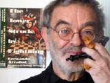 El dramaturgo Fernando Arrabal con cuatro figuras y una torre herida: Foto: Lis.