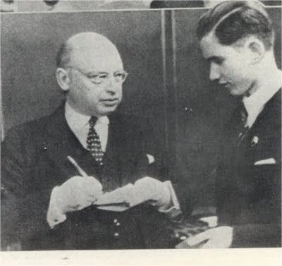 Savielly Tartakower trabajando como periodista especializado en este torneo, entrevistando a Paul Keres