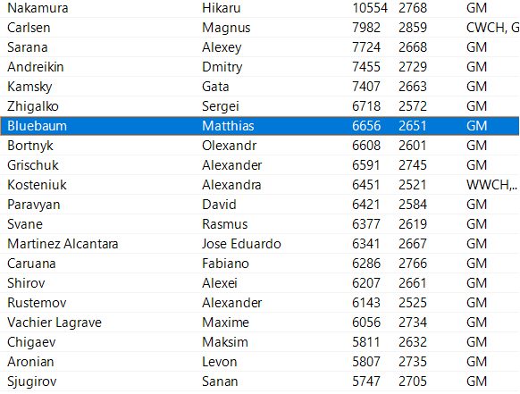 ¿Cómo puede explicarse este salto repentino? Un factor posible es que, junto a su carrera profesional como ajedrecista, Matthias Bluebaum estudió matemáticas en la Universidad de Bielefeld a partir de 2015, y completó con éxito sus estudios en 2022. Ahora puede concentrarse plenamente en el ajedrez. Lo que también llama la atención es la cantidad de partidas registradas a su nombre en la Mega Database. Bluebaum figura allí con alrededor de 6.500 partidas disputadas, lo que lo sitúa entre los jugadores con mayor número de partidas.
