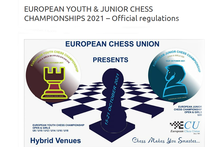 15/10/2021 – Entre el 15 y el 22 de octubre de 2021 se disputan los Campeonatos Juveniles de Europa en las categorías de edad sub-8 hasta sub-20. Hay retransmisiones en directo en live.chessbase.com y dentro de esta noticia. | Logo: Campeonato