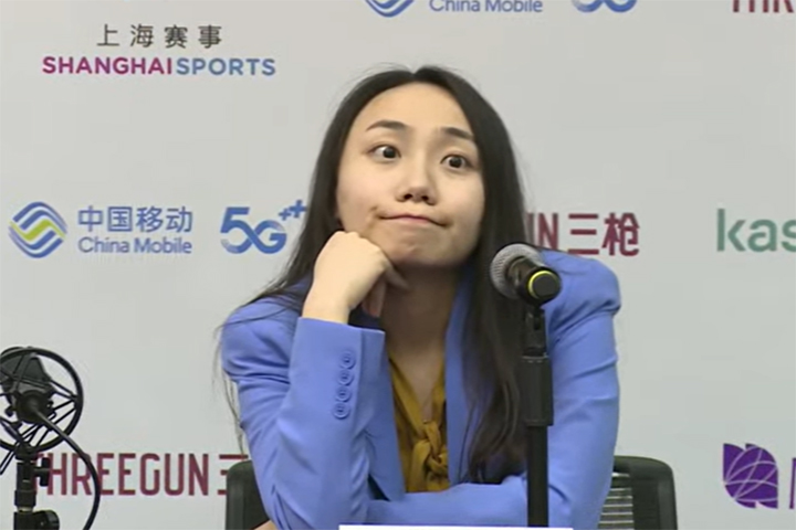 11/07/2023 – La defensora del título, Ju Wenjun, y su compatriota Lei Tinjie disputan un match a 12 partidas por el Campeonato Mundial Femenino de Ajedrez. La primera parte del encuentro se disputa en Shanghai y la segunda en Chongqing. | Sigue las partidas en directo con comentarios de expertos desde las 9.00 CEST (3.00 ET, 12.30 IST) Hoy en la quinta partida, Lei Tingje se impuso con blancas a Ju Wenjun. Ha sido la primera partida que terminó con una victoria. Las cuatro anteriores habían terminado en tablas, con lo cual ahora Lei Tingjie manda 3:2. Crónica por Milan Dinic, traducida al castellano. | Foto: captura del vídeo de la rueda de de prensa tras la partida