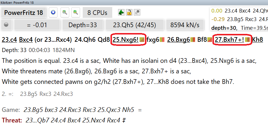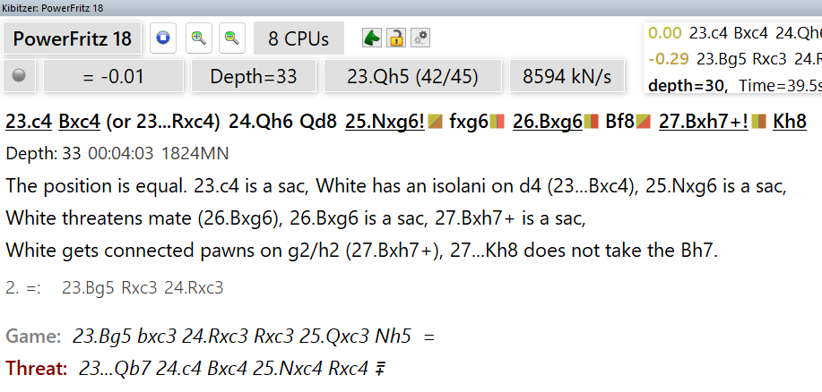 Fíjense en la apariencia pro detrás de los movimientos. El programa no solamente anota la partida con los movimientos y con signos como "?" o "!", sino al pasarles el ratón, verá la posición analizada a la derecha del tablero. A mi esto me ha parecido muy útil. Nuevamente: una ventaja muy grande para los jugadores aún menos experimentados.
