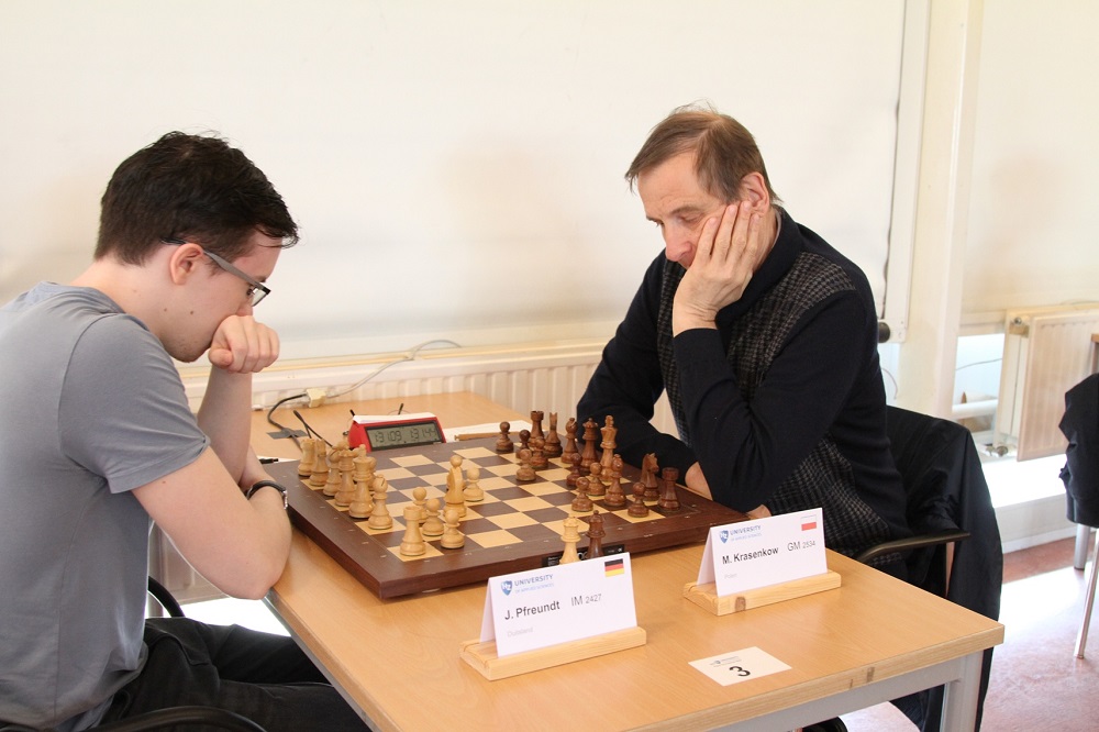 El GM veterano Vyacheslav Ikonnikov cedió medio punto en el tablero 6 contra el joven holandés William Gijsen (rival del autor de este artículo en la primera ronda), al final de un final de torres. El MF Tobias Voege siguió mostrando su buena forma y logró unas tablas contra el "Noch-IM und Bald GM") Koen Leenhouts.