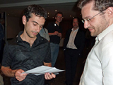 Uno de los primeros jugadores a los que enseñamos el problema fue Levon Aronian (a la derecha en la foto arriba), entre sus partidas en el Campeonato del Mundo de Ajedrez Rápido GrenkeLeasing. Resolvió el problema al instante, pero confesó: "Es que conozco la posición. ¡He leído el libro de Donner!" Levon agregó: "Enséñaselo a Gabriel Sargissian". [Gabriel es el entrenador de Aronian que