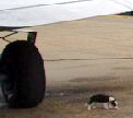 entrevista. Por debajo del ala del avión está un perro o un gato.