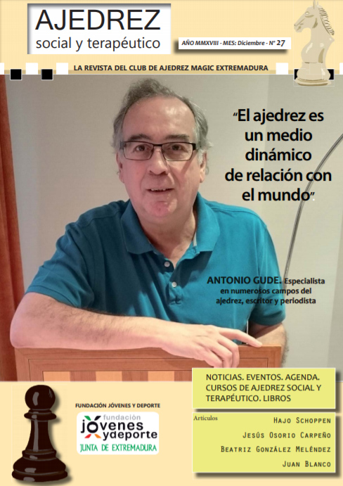 tengo el placer de presentaros el número 27 de la revista que el Club Magic Extremadura edita junto a la Fundación Jóvenes y Deporte, “Ajedrez Social y Terapéutico”, la publicación que se ha consolidado ya como la gran referencia mundial de las modernas aplicaciones sociales y terapéuticas del ajedrez. Este número lo consideramos como un ejemplar excelente, por lo que tiene de muestra de experiencias magnífi cas que se están celebrando en España, Europa y Latinoamérica. Portada y entrevista de este número son para Antonio Gude, autor de innumerables libros de ajedrez de gran calidad, periodista, traductor… Una persona de gran prestigio, que no necesita presentación alguna para los buenos afi cionados al ajedrez. Gude demuestra que tiene una aguda visión del ajedrez del siglo XXI, y no elude pronunciarse sin tapujos sobre numerosos temas de la más rabiosa actualidad. Hajo Shoppen, desde Holanda, nos muestra una iniciativa que creemos extraordinaria, y es la combinación nada menos que de artes marciales y ajedrez. Una experiencia que solo puede llevar a cabo una persona experta en ambas materias, y que ya está en marcha. Excelente. Como tremendamente atractiva es la iniciativa de Jesús Osorio Carpeño desde Cantabria, con su empeño con llevar el ajedrez a la calle, visibilizarlo, con todo lo ello implica en cuanto a socializar este maravilloso juego. Beatriz González Meléndez, psicóloga, repite con otro gran artículo, donde nos habla de la metodología que imparte el Club Magic Extremadura con mayores y en comunidades terapéuticas: un artículo muy técnico y profesional. Y por último, el venezolano Juan Blanco, profesor en Educación Física y Doctor en Educación, nos muestra la que creo que es una experiencia maravilloso en Perú, adonde se ha trasladado, que lleva a cabo el también Doctor en Educación Alberto Collazos. Un trabajo digno de ser conocido a nivel mundial.
