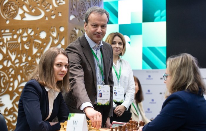 Dvorkovich ingugurando el Grand Prix Femenino en el tablero de Anna Muzychuk