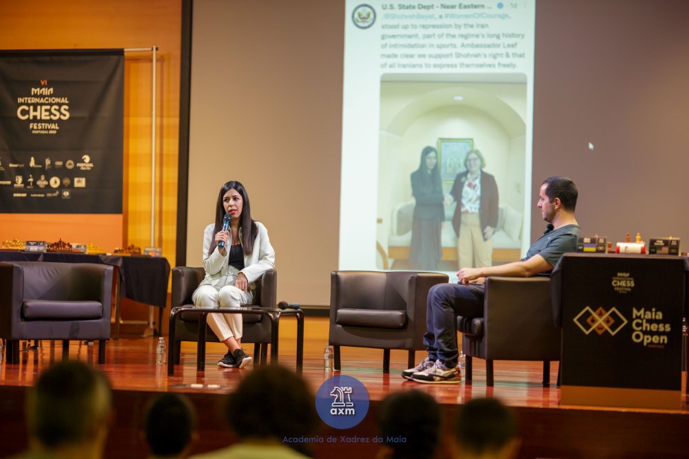 Shohreh Bayat dando una charla | Foto: Festival de Ajedrez en Maia 2023