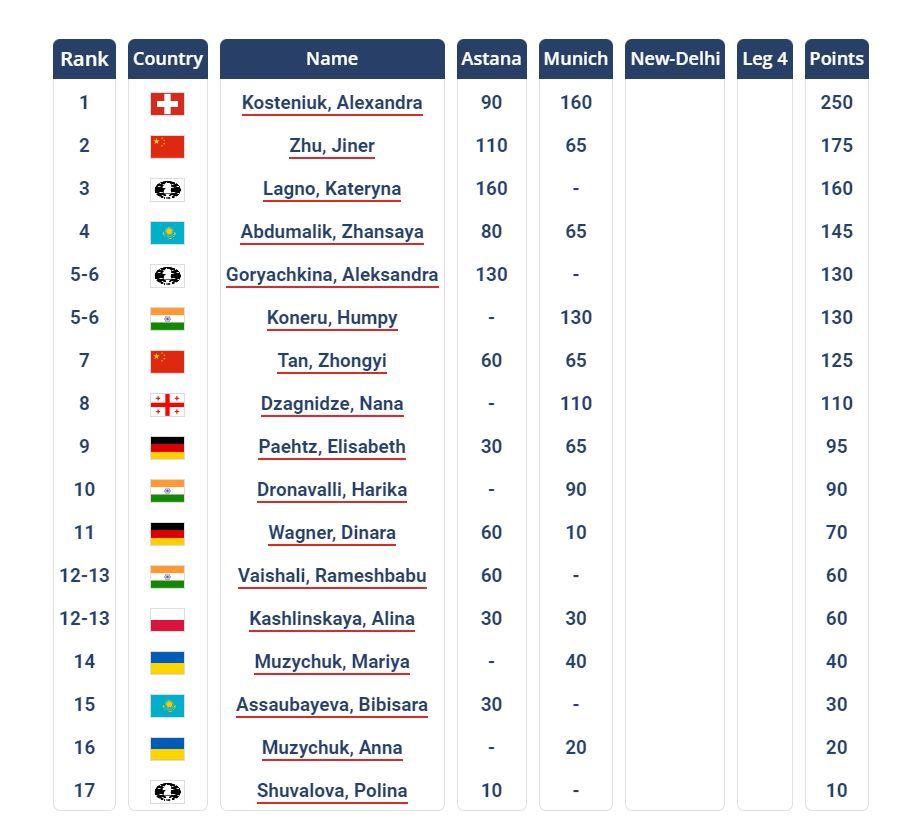 La clasificación actual del Grand Prix Femenino de la FIDE, temporada 2022/2023