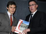 Karjakin recibiendo la invitación del Director Técnico de la Final de los Maestros en Bilbao, Juan Carlos Fernández