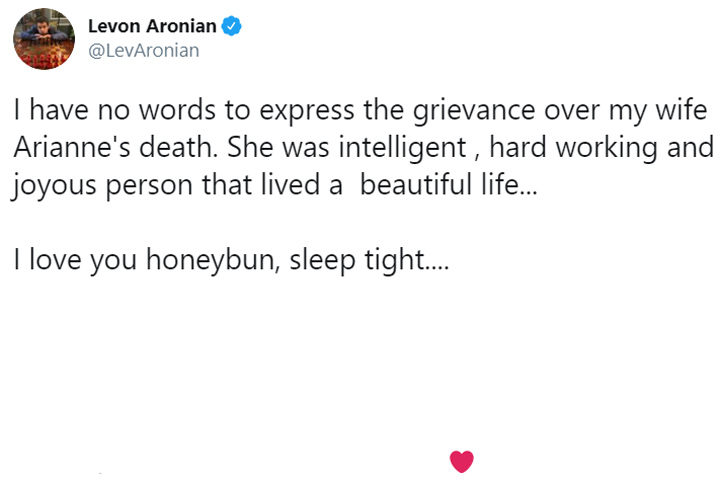 31/03/2020 – Ha fallecido Arianne, la esposa de Levon Aronian. "No tengo palabras para expresar mi dolor por el fallecimiento de mi esposa Arianne. Era inteligente, trabajadora, era alegre y estaba viviendo una vida maravillosa...". Así comunicaba Levon Aronian en Twitter la muerte de su mujer, Arianne Caoili. La noticia nos deja a todos en estado de shock. Sin haberla conocido muy bien, salvo durante fugaces encuentros en torneos en los que siempre me conquistó por su simpatía, el hecho de que Levon se enamorara de ella, es la prueba de que hemos perdido a una persona maravillosa. Estamos muy tristes. Nuestras más sinceras condolencias.