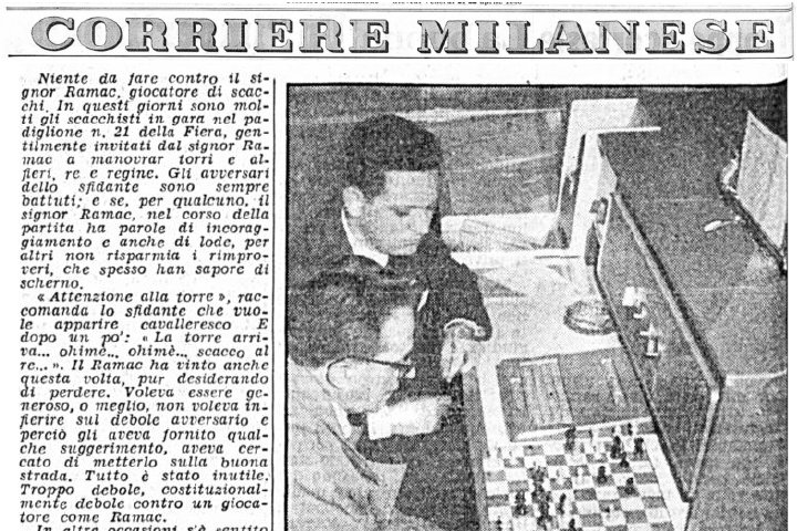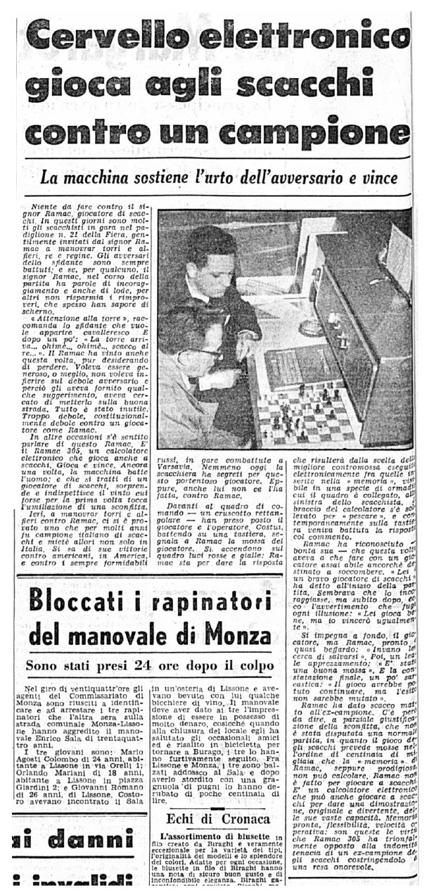 El artículo sobre el duelo temprano hombre vs. máquina se publicó en el periódico italiano "Corriere di Informazione" (del grupo Corriere della Sera, Milán) y salió el 21/21 de abril de 1960, es decir hace más de 60 años.