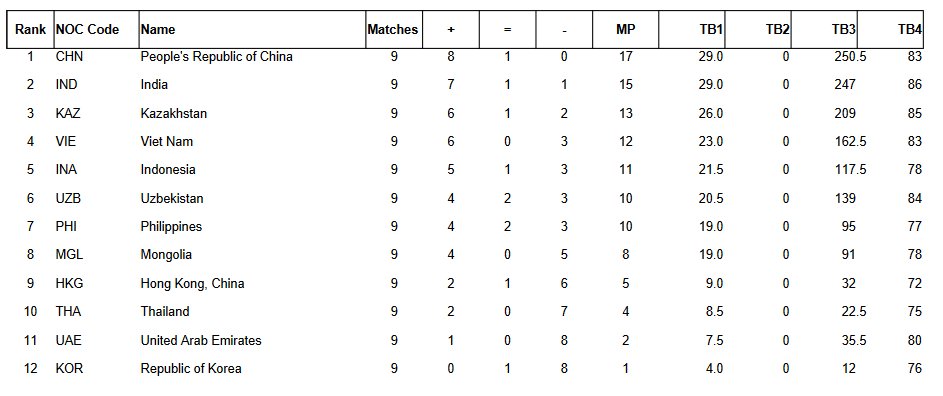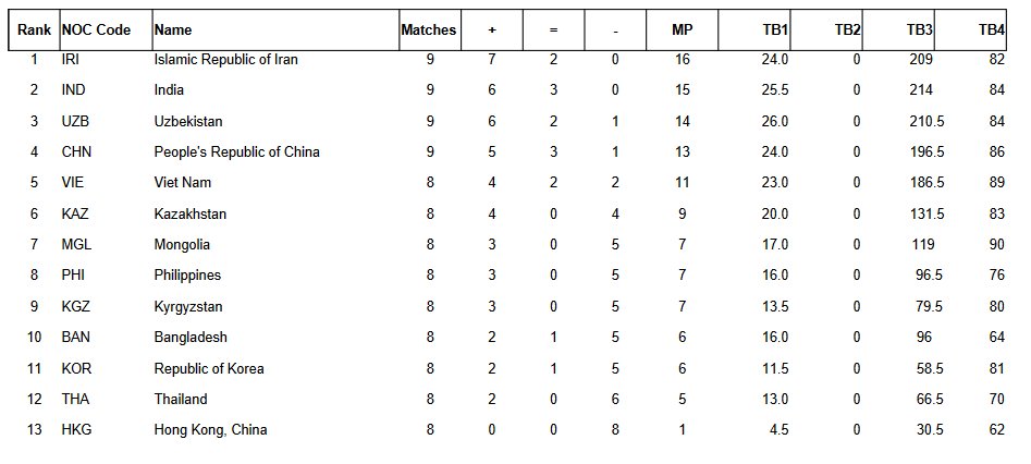 Los jugadores iraníes tuvieron una excelente actuación, cediendo sólo dos empates ante sus rivales (contra India y Vietnam) y ganando siete duelos en total, incluido el que resuló ser el enfrentamiento decisivo con Uzbekistán. El equipo iraní llegó a la ronda final con un punto de ventaja sobre India y se aseguró el título con una victoria por 4-0 sobre Corea del Sur.