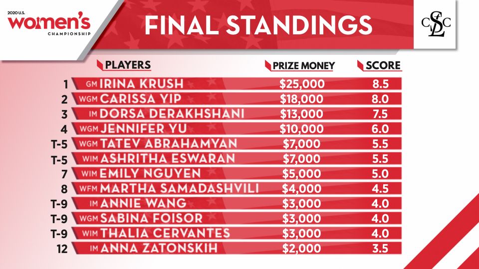 26/10/2020 – Irina Krush, superviviente del covid-19 pero con molestias todavía, causados por el virus, ha ganado el Campeonato Femenino de EE. UU.. Es su octavo título como campeona nacional de los Estados Unidos de América. En esta ocasión, debido a la pandemia, el torneo se ha disputado a través de internet. El sábado había ganado ambas partidas y en la última ronda quedó con un punto de ventaja frente a Carissa Yip en la clasificación final. Dorsa Derakhshani ocupó el tercer puesto. Crónica final.