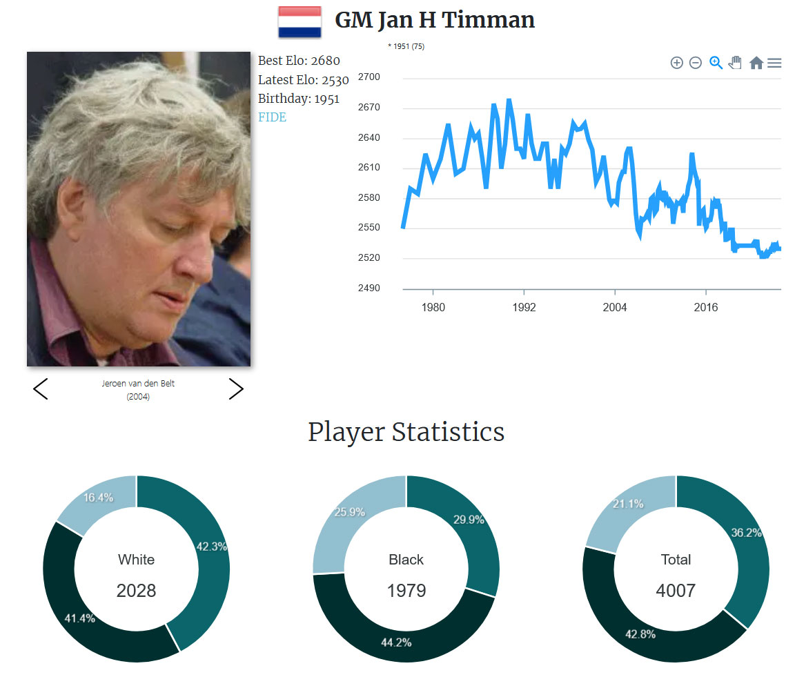 Nuestro portal de jugadores de ChessBase ofrece información completa sobre la carrera ajedrecística de Jan Timman: la evolución de su rating Elo, sus rivales favoritos y menos preferidos, sus mejores partidas y sus derrotas más duras, sus aperturas con blancas y negras, entre otros aspectos. Haga clic aquí para acceder a todo este material, que incluye una selección de sus mejores partidas.