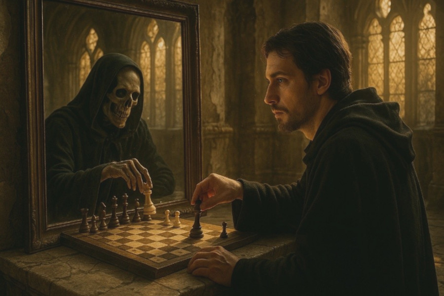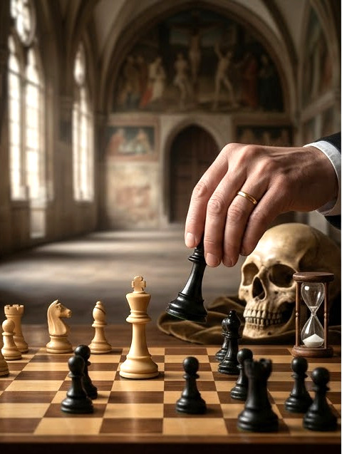 El tablero de ajedrez, con su orden geométrico y su destino inevitable, refleja la condición humana: cada partida es una vida en miniatura. Inicia con potencial, se desarrolla entre elecciones y conflictos, y termina inexorablemente en un desenlace —jaque mate o tablas—. Así, el memento mori se expresa en cada movimiento: todo lo que nace en el tablero está destinado a perecer. Ninguna pieza es eterna, ni siquiera el rey. El ajedrez enseña, como la filosofía estoica, que la muerte (el fin) da sentido a la existencia (la partida).