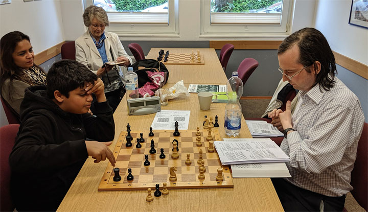 Young talent Dev Shah working with endgame expert GM Karsten Müller. Behind Dev is his mother Krupali, next to her my wife Ingrid – we were picking them up for dinner.