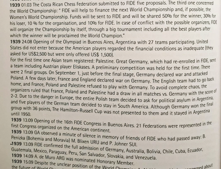 3) En nuestros registros se deducen 7 ausentes: Letonia, Países Bajos, Islandia, Bulgaria, Irlanda, Palestina y Dinamarca, pero en realidad debemos eliminar a Letonia, que no envió delegado a las sesiones del Congreso. Los votos afirmativos no fueron solamente de “países sudamericanos no representativos”, como dijo absurdamente en cierto momento Adolf Jakob Seitz. La lista completa es la siguiente: Polonia, Francia, Alemania, Hungría, Estonia, Lituania, Cuba, Canadá, Protectorado de Bohemia y Moravia, Uruguay, Chile, Paraguay, Bolivia, Perú, Brasil, Costa Rica, Guatemala y Ecuador. Como puede verse, al menos la mitad de los votos correspondieron a federaciones de las consideradas grandes, en una evaluación cualitativa que es la que suele sostenerse desde una perspectiva eurocéntrica para referirse a las entidades nacionales tradicionales (que vienen del impulso del ajedrez desde el siglo XIX).