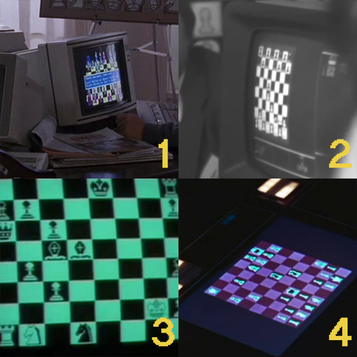 Cuatro escenas de películas de cine con escenas de ajedrez informático