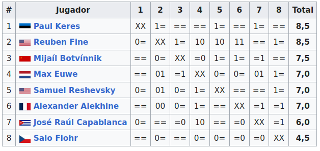 A Keres y Fine les escoltaron Mikhail Botvinnik, Max Euwe. Samuel Reshevsky, Alexander Alekhine, José Raúl Capablanca y Salo Flohr.