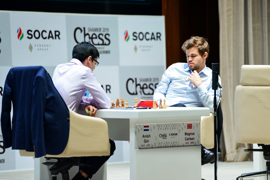 Anish Giri y Magnus Carlsen | Foto: Shamkir Chess 2019