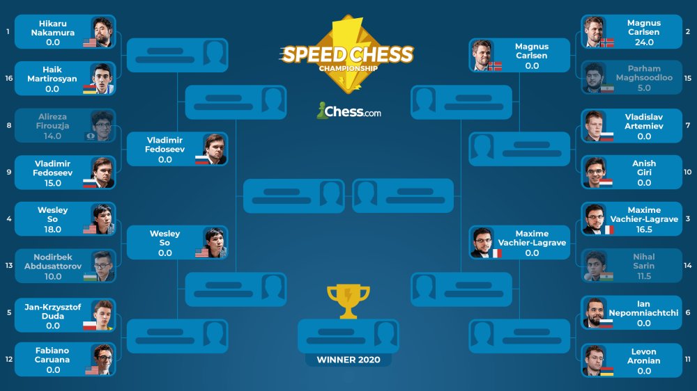 12/11/2020 – ctualmente, la segunda ola de la pandemía está evitando prácticamente cualquier tipo de torneo presencial. También los desafíos de la elite mundial han regreado a internet. Entre el primero de noviembre y el 13 de diciembre, los 16 mejores jugadores de ajedrez del mundo están cruzando sablos en el Campeonato de Ajedrez Relámpago "Speed Chess Championship 2020". El torneo se disputa por sistema eliminatorio y se trata de un torneo de ajedrez relámpago. Hay retransmisiones en directo a partir de las 18:00 CET.