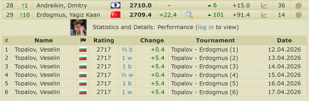 En realidad, Erdogmus superó la barrera de los 2700 (en directo) tras su victoria en la quinta partida, disputada el 16 de abril de 2026, cuando alcanzó los 2704 puntos. Yagiz nació el 3 de junio de 2011, por lo que aquel día tenía 14 años, 10 meses y 13 días.
