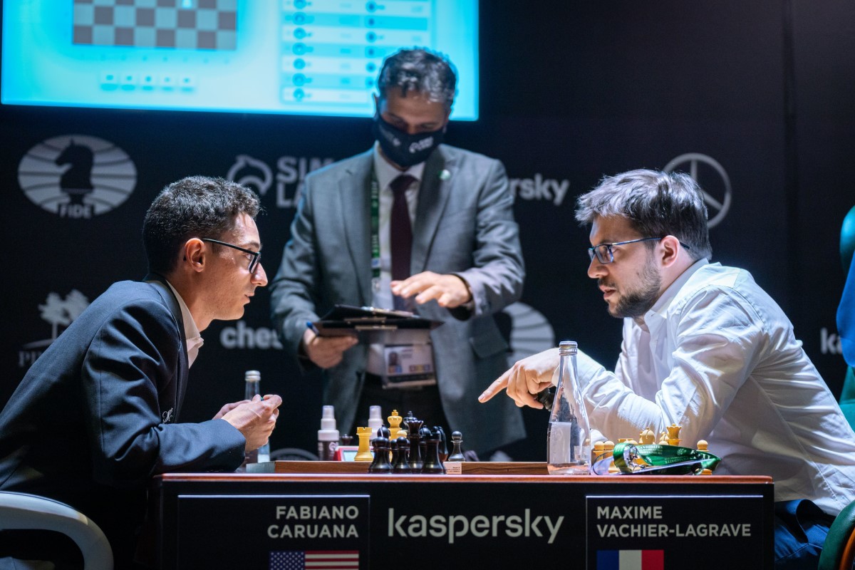 20/04/2021 – En la octava ronda del Torneo de Candidatos 2020/2021, Fabiano Caruana derrotó a Maxime Vachier-Lagrave. Tras más de un año, ayer se retomó la competición aplazada en marzo de 2020 por la crisis del coronavirus. En la partida de ayer, Caruana planteó una agresiva novedad en la Siciliana Najdorf. Alcanzó una posición ligeramente superior en el final de la partida y la convirtió en una impresionante victoria. Kirill Alekseenko derrotó a Alexander Grischuk. Ian Nepomniachtchi firmó tablas con Anish Giri y ha tomado el mando en solitario. Esta tarde, se disputará la novena ronda. | Foto: Lennart Ootes (Torneo de Candidatos 2021)