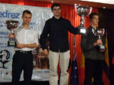 Los dos ganadores: Sergei Zhigalko y Maxime Vachier-Lagrave, con Michal Olszewski, el tercer clasificado