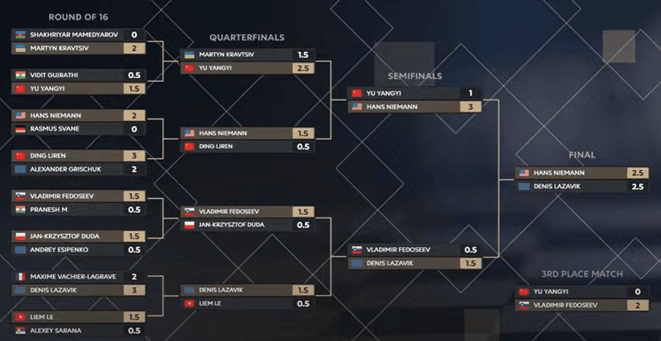 El eliminatorio comenzó el jueves con los octavos de final y los cuartos. Al finalizar el día, las semifinales quedaron definidas de la siguiente manera: Yu Yangyi se enfrentaría a Hans Niemann y Denis Lazavik a Vladimir Fedoseev.