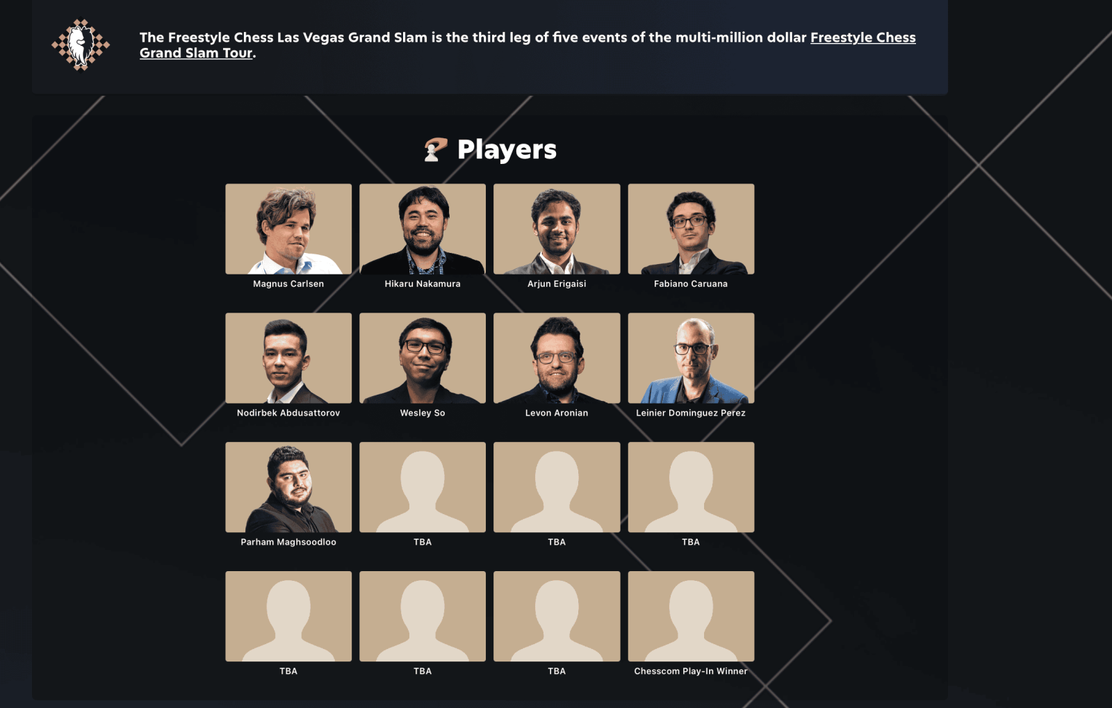 La tercera etapa del Grand Slam de Ajedrez Freestyle se celebrará en Las Vegas del 16 al 20 de julio. El prestigioso evento contará con 16 participantes, y hasta esta semana, ya se han confirmado 10 nombres. Entre los 9 invitados anunciados previamente figuran la dupla de jugadores con mayor rating Elo del mundo, Magnus Carlsen y Hikaru Nakamura. El viernes, Hans Niemann se unió a la lista de participantes tras ganar el torneo clasificatorio online.
