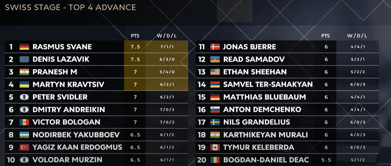 El torneo abierto fue muy fuerte, con competidores de élite como Peter Svidler, Dmitry Andreikin y Matthias Bluebaum, quienes, por cierto, quedaron fuera de la clasificación. Los cuatro que avanzaron al eliminatorio fueron Rasmus Svane, Denis Lazavik, Pranesh M y Martyn Kravtsiv.