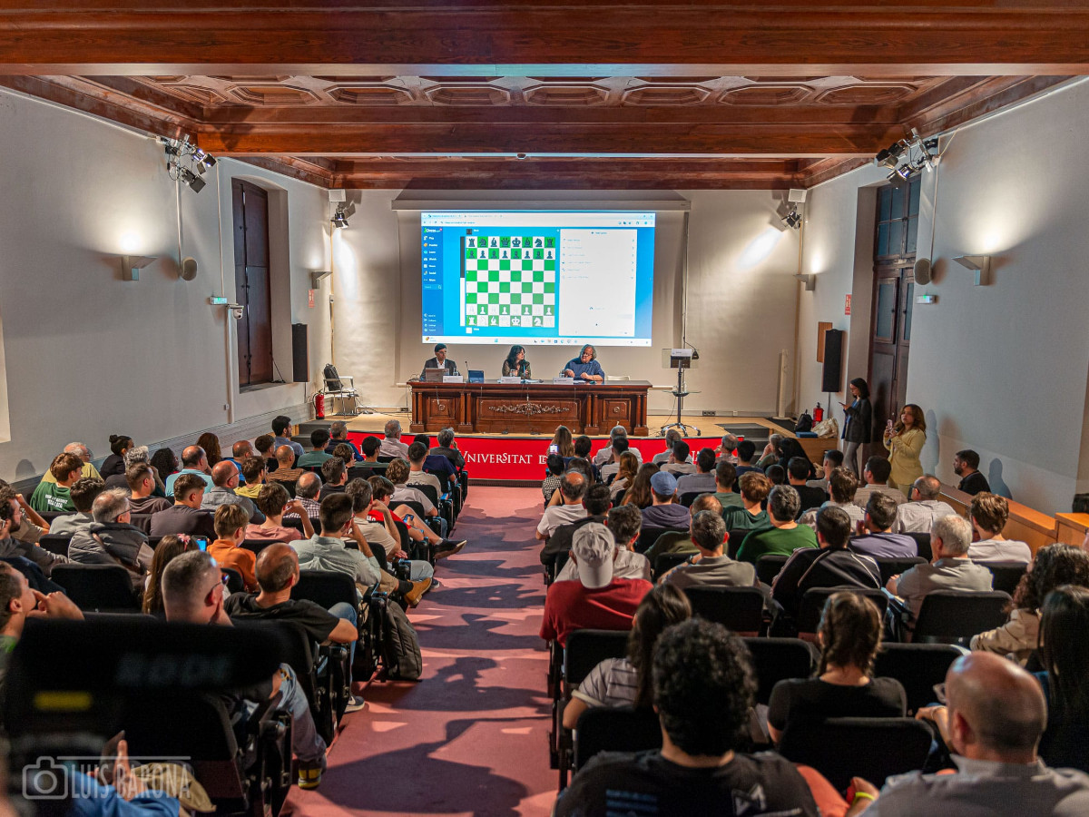 El día 16 de mayo se vivió uno de los actos centrales del 550 Aniversario del nacimiento del ajedrez moderno en Valencia (1475-2025): una clase magistral del GM Anand analizando algunas de sus famosas partidas. Una verdadera delicia para los numerosos aficionados que llenaron por completo el Aula Magna del Centro Cultural La Nau de la Universitat de València.