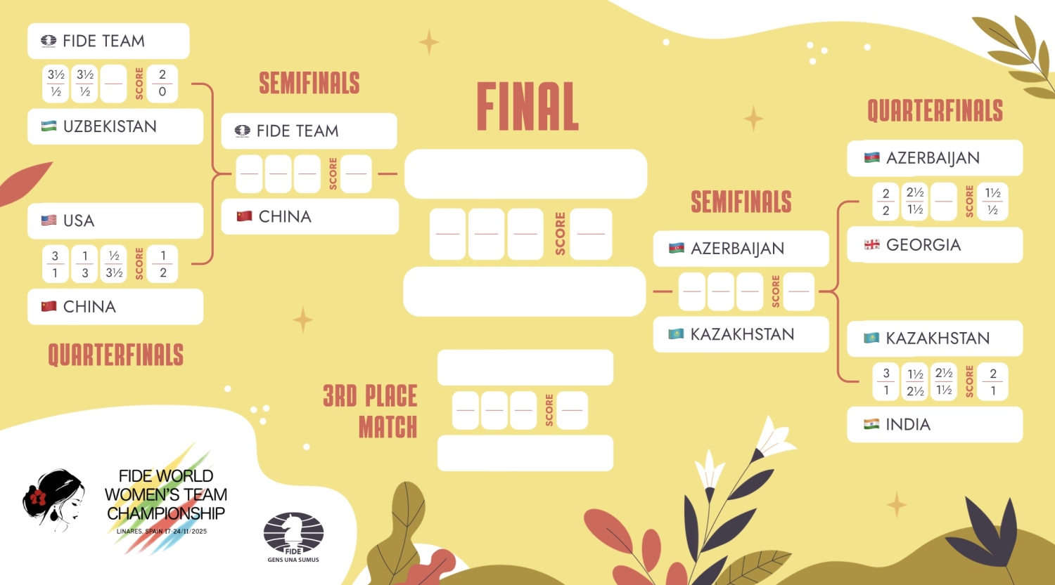 23/11/2025 – El Campeonato Mundial Femenino por Equipos se está celebrando en Linares, España, del 18 al 23 de noviembre. El evento reúne a 12 selecciones nacionales, entre ellas China, India, Estados Unidos y el país anfitrión, España. Con la participación de jugadoras destacadas como Hou Yifan, Carissa Yip y Sara Khadem, el campeonato presenta un plantel muy fuerte en una ciudad históricamente vinculada al ajedrez de élite. | Sigue las partidas en directo a partir de las 13:30 hora de Madrid (9:30 Buenos Aires, 6:30 Ciudad de México).