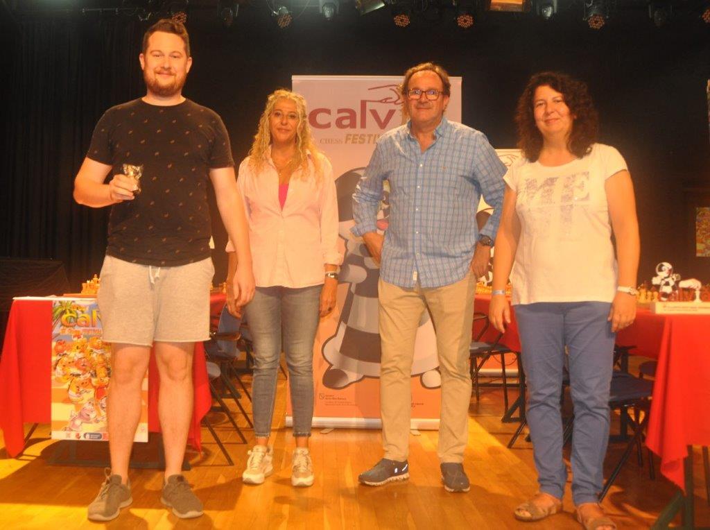 El podio con los tres primeros, con Mónica Calzetta, Chelo Pou (federación) y Rafael León (responsable de deporte y turismo del Ayuntamiento de Calvià) | Foto: Festival de Ajedrez de Calvià 2023