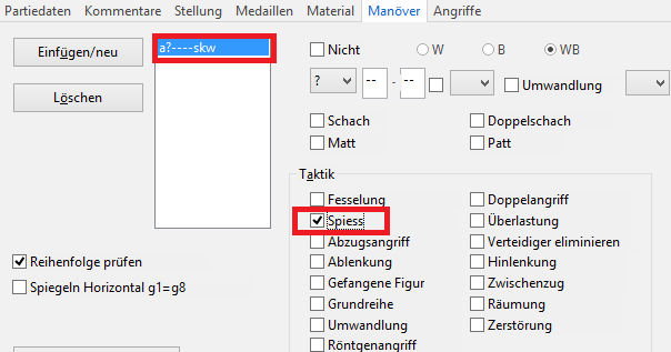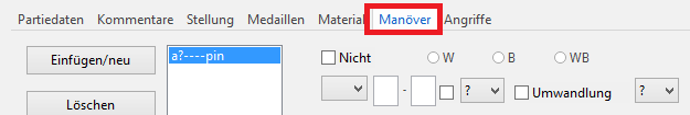 Bei der Definition der Suche nach einem bestimmten Manöver müssen Sie darauf achten, dass die Bezeichnung der Figuren immer mit englischen Kürzeln definiert wird. Im ersten Schritt definiert man, ob das Manöver von Weiß oder Schwarz ausgeführt werden soll. Alternativ kann auch festgelegt werden, dass die Suche unabhängig von der Farbverteilung durchgeführt wird. Dann wird die ausführende Figur bestimmt (Turm=R), dann das Ausgangsfeld, wobei ein Fragezeichen verwendet wird, wenn es sich nicht um eine bestimmte Reihe oder Linie handelt.
