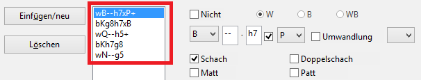 Das Zielfeld wird auf die gleiche Weise festgelegt und dann wird bestimmt, ob eine gegnerische Figur geschlagen wird oder nicht. Um die Suche zu verfeinern, wird der Antwortzug des Gegners definiert. Werden mehrere Züge definiert, ist darauf zu achten, dass das Programm gegebenenfalls die Reihenfolge der Manöver berücksichtigt.