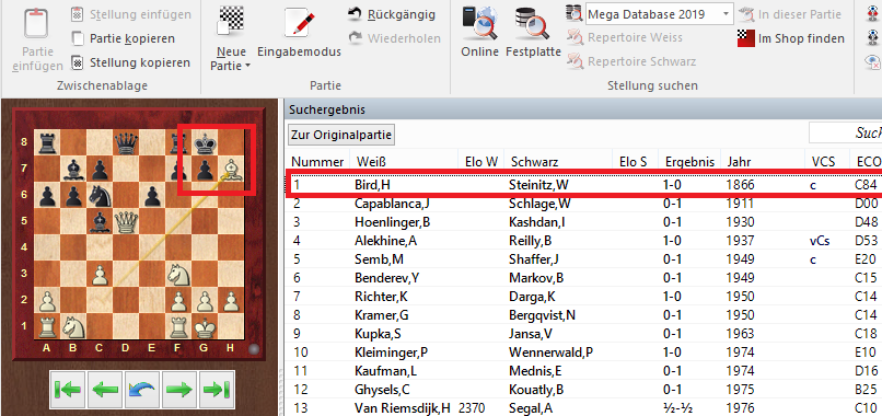 Nach dem Duchlauf der Suche werden die entsprechenden Partien aufgelistet. Per Klick auf einen Partielisteneintrag zeigt das Programm umgehend die entsprechende Position, aber der das vordefinierte Manöver vorgekommen ist.